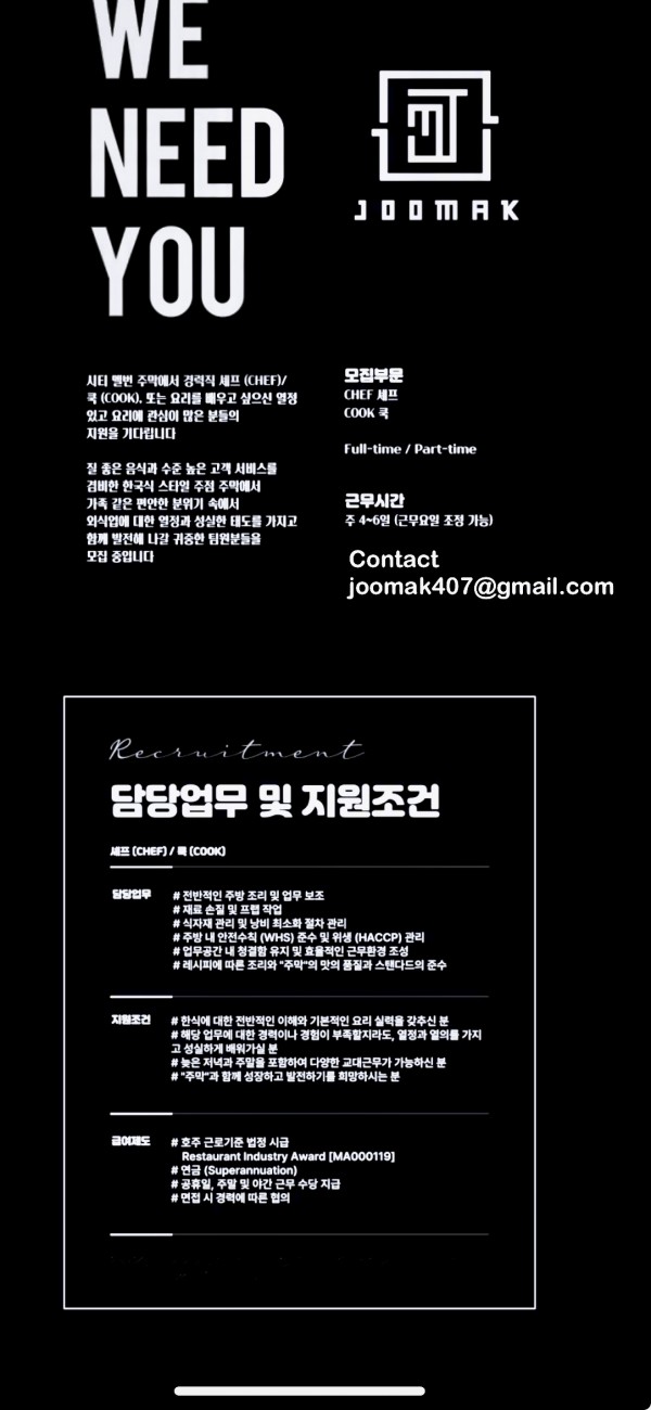 "Joomak" [시티 주막] 셰프(CHEF).쿡(COOK).주방보조(KITCHEN HAND) 채용 공고