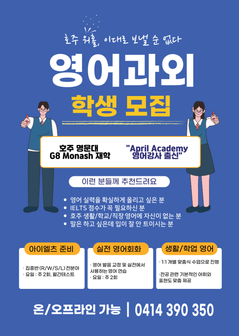 단기간 동안 아이엘츠 점수 높이시고 싶으신 분들, 호주 워킹홀리데이 하는 동안 영어실력 많이 쌓고 돌아가고 싶으신 분들 편하게 연락주세요!