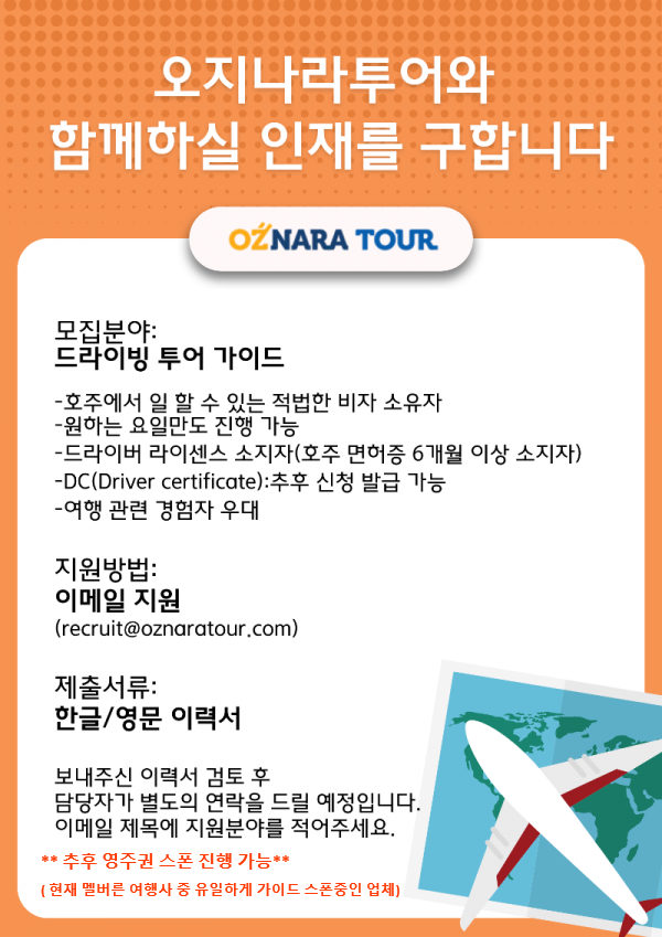 [구인] **(영주권스폰중인 업체, 세컨비자 지원가능) 멜버른No1여행사 오지나라에서 드라이빙 투어가이드를 모십니다.